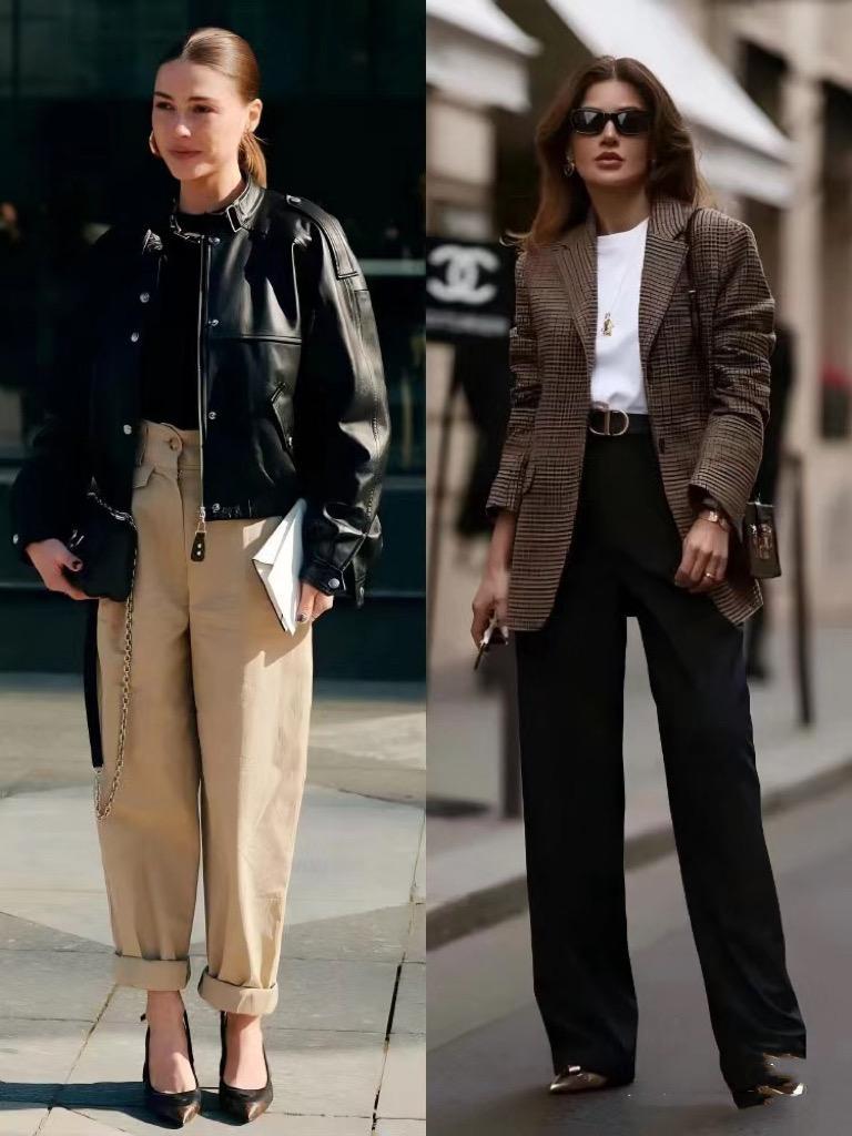 這時候通過高挑腰線,來營造大長腿的酷颯美,就是不錯的方式。高腰闊腿褲,儘量配短上衣。或者高腰闊腿褲搭配上衣塞衣角的方式,配高跟鞋踩更酷颯拉風。