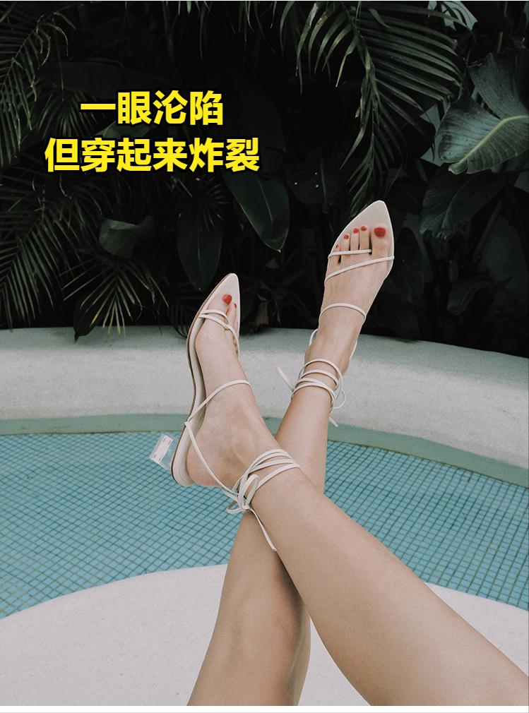 這是屬於看的時候第一眼淪陷,穿的時候炸裂的鞋子。層層疊疊的綁帶真的穿是心累,上班出勤有這時間浪費。重點是勒完之後腿上一圈又一圈的印跡,真的很熱鬧誇張啊。