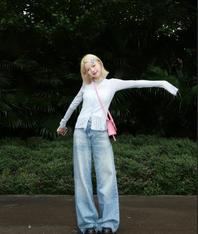 真的很期盼秋天快點到來,這一件薄款的針織上衣,版型是修身的,穿起來能很好修飾身材,顯瘦效果極佳的。低飽和度的藍色,太襯膚色了。選擇一條直筒牛仔褲來配,一秒打造出大長腿。