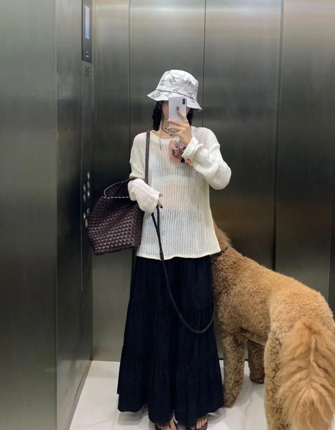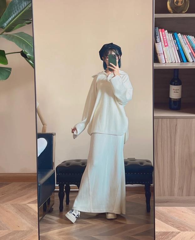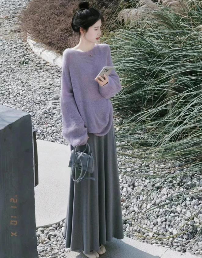 很顯溫柔的一套穿搭,慵懶感十足的紫色針織毛衣,搭配灰色針織半身長裙,這兩種顏色組合一起,也太時髦高級了。上下都是寬鬆的版型,最藏肉顯瘦了,裙子的面料很柔軟,垂墜感也非常贊,視覺上能拉長腿部線條。