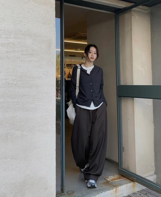 秋日裏,一定要給自己準備件針織開衫啊,這種軟軟糯糯的小開衫,單穿或者是疊穿都非常不錯,裏面疊穿了件白色t恤,選擇一條休閒西裝褲來配,鬆弛感十足,加上一雙運動鞋,又多了幾分休閒氣息。