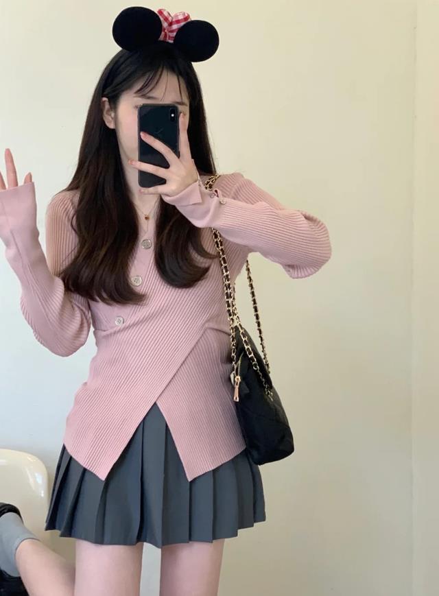 純欲的一套穿搭,看起來也太不錯了,純欲交叉v領針織衫,這一件上衣實在是太顯瘦了,可休閒可氣質,穿起來一整個就是“紙片人”的既視感,配一條灰色百褶短裙,青春減齡又不失活力。