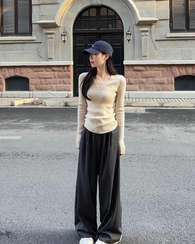 很顯日常的一套,真的是非常好穿又百搭呢,基礎簡約款的針織打底,秋季單穿起來就可以,修身的版型,將上身的比例勾勒得很完美。選擇一條深灰色闊腿褲,垂墜感十足的褲子,那可太拉腿長了,顯瘦效果非常不錯。