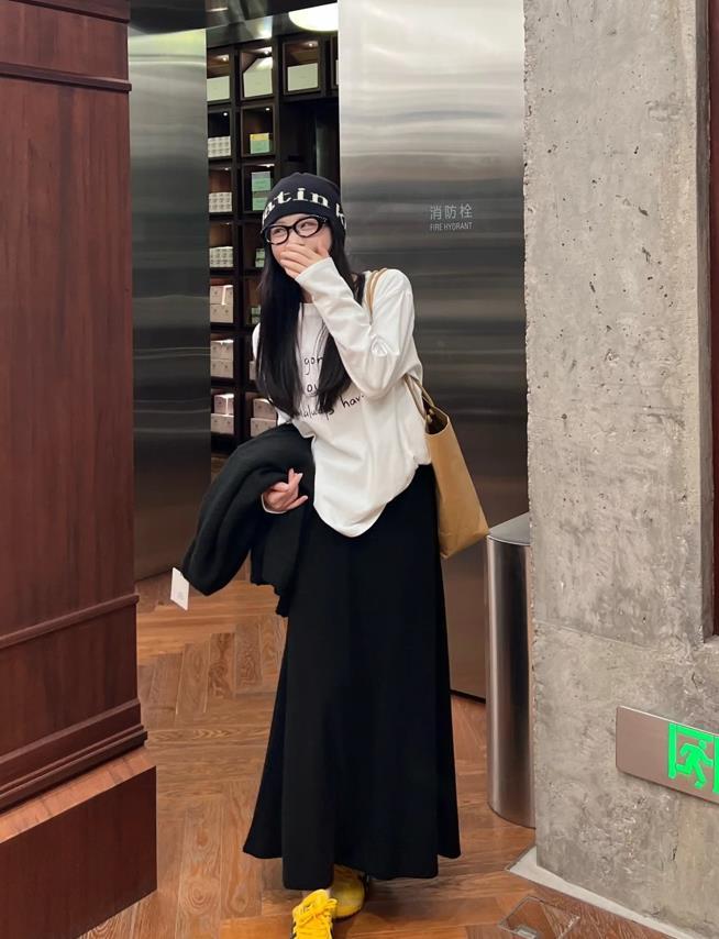 黑白配的穿搭,就是非常耐看了,完全不用擔心會出錯的,白色長袖t恤,與黑色針織半身長裙相配,裙子垂墜感十足,寬鬆的裙身,給足身材包容性,太藏肉顯瘦了,整體的風格就是休閒又舒適。
