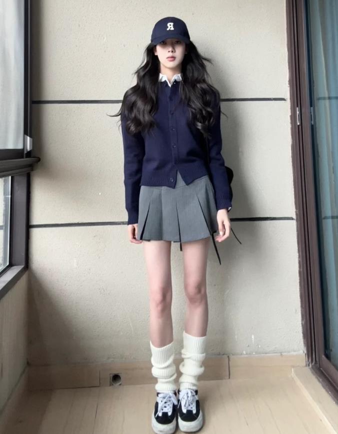 藏藍色開衫,真的很顯白啊,短款的針織開衫,專屬於小個子女生的款式,可以單穿,也可以在裏面疊穿一件襯衫,增加層次感又時髦。選擇一條灰色百褶短裙,這樣的搭配青春又活力,簡單大氣又好看。