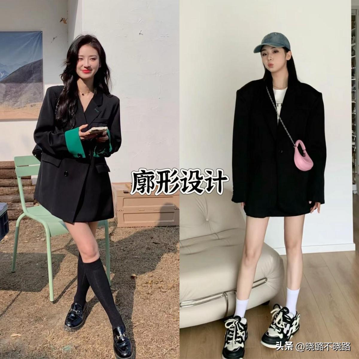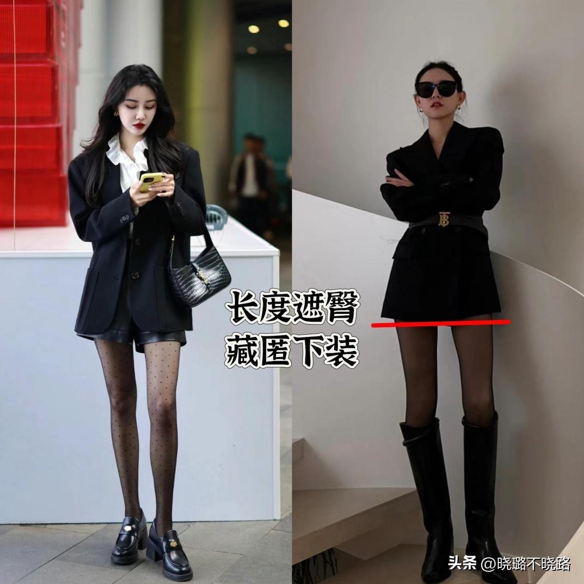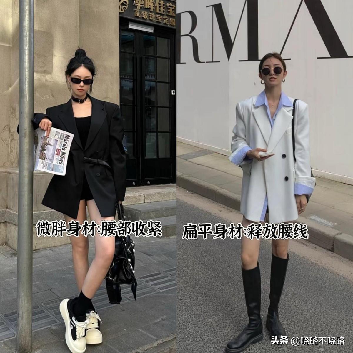 在具體挑選下衣失蹤裝的時候,建議大家不要選擇太修身的款式,而是要優先嚐試廓形款,比如這種大廓形設計的遮臀款西裝,無論是單穿還是疊穿,都是非常時尚的。