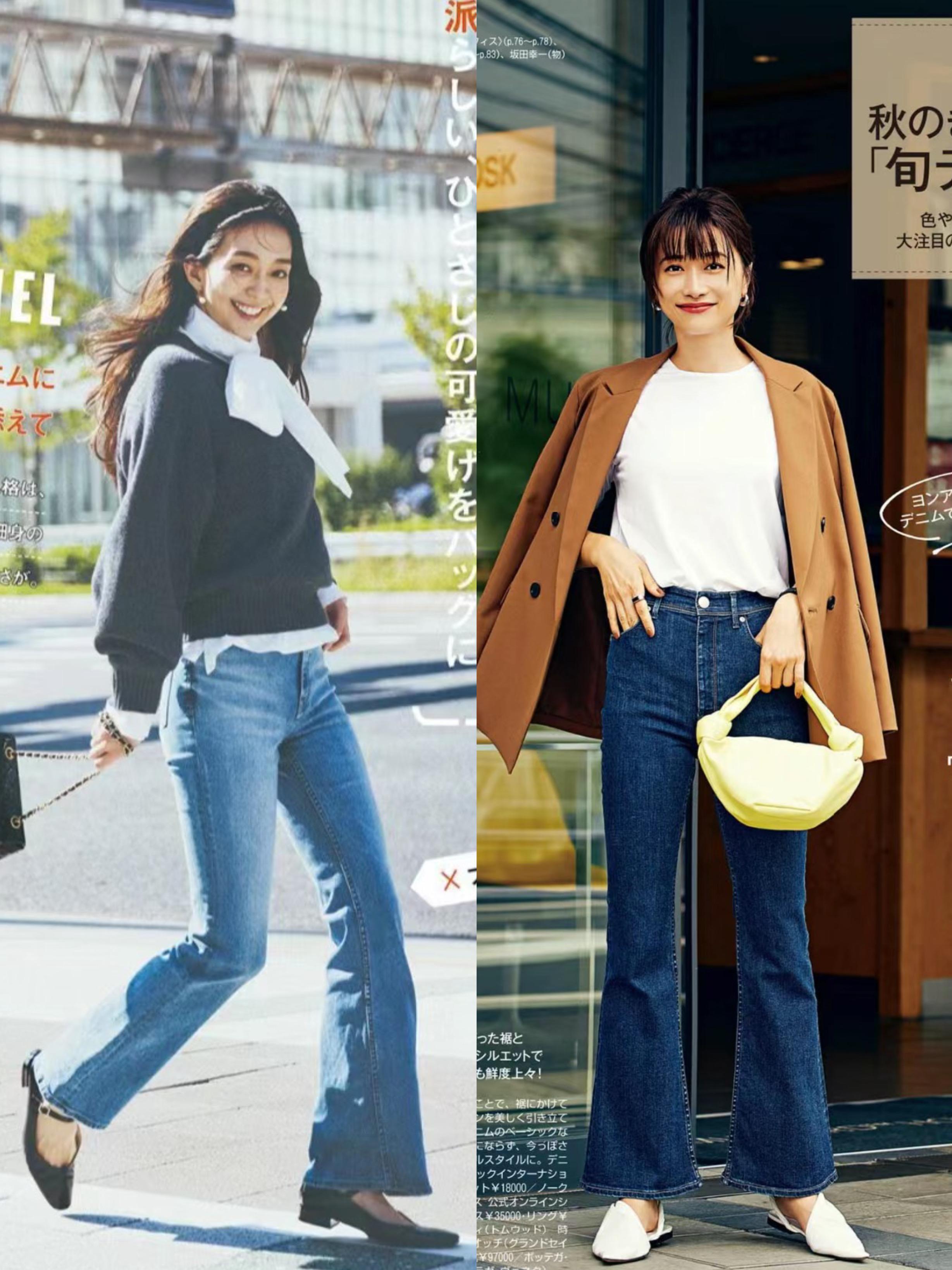 入秋後,牛仔喇叭褲的穿搭,對小個子更友好。如果你的個子不是很好,這種高腰、且微喇的牛仔喇叭褲,就是更好的選擇。