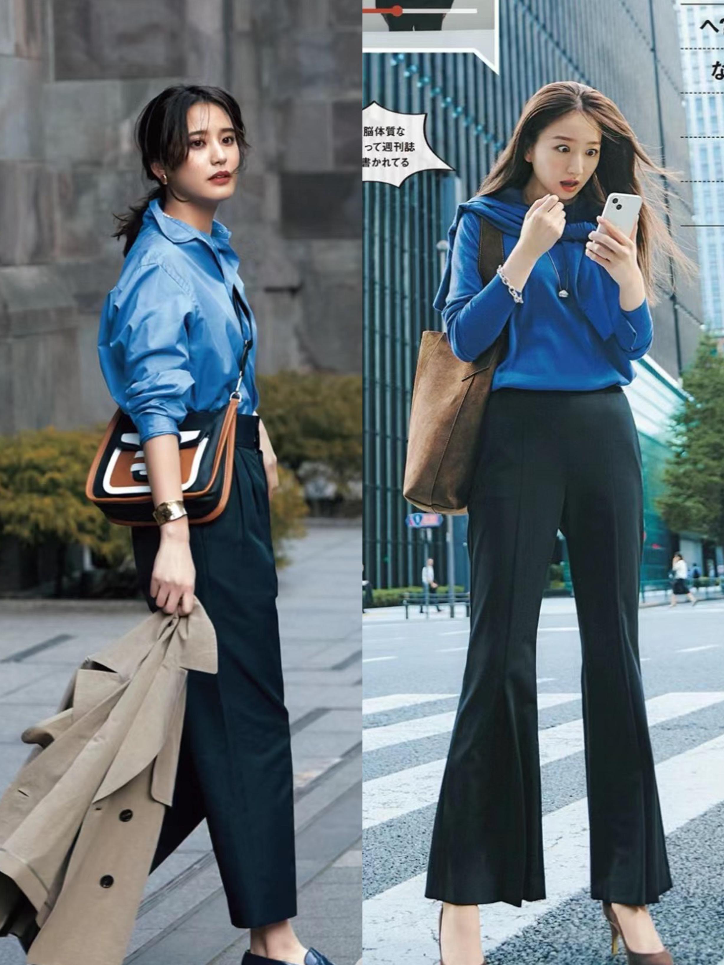 深藍色的襯衫、或者針織衫,可以搭配黑色的高腰褲穿着。將深藍色襯衫/針織衫的下襬塞進褲腰裏,以上短下長的形式,表現出更時尚酷颯的美。