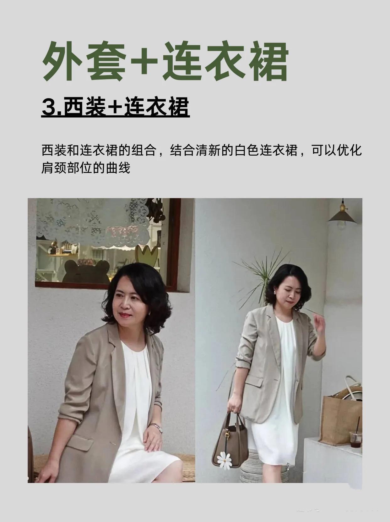 一組更加優雅、也更顯氣質的穿搭look。西裝外套+白色連衣裙,可以優化肩頸部的線條、在無形中提升氣質。