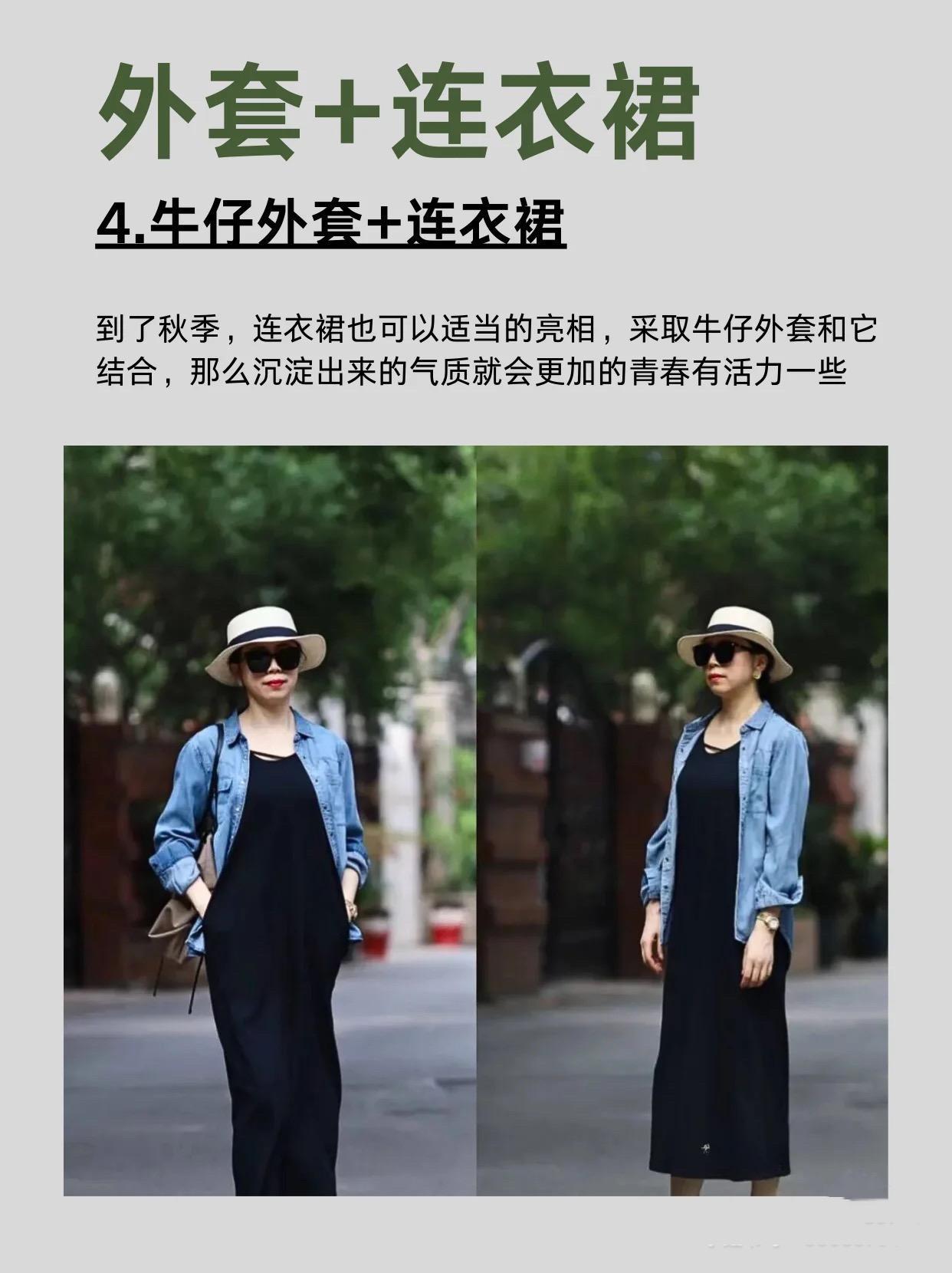 如果想要更減齡一些的穿搭,五六十歲的女人就可以參考這組搭配。牛仔外套配上黑色連衣裙,優雅又顯瘦。面料柔軟的牛仔外套,舒適性也更強。