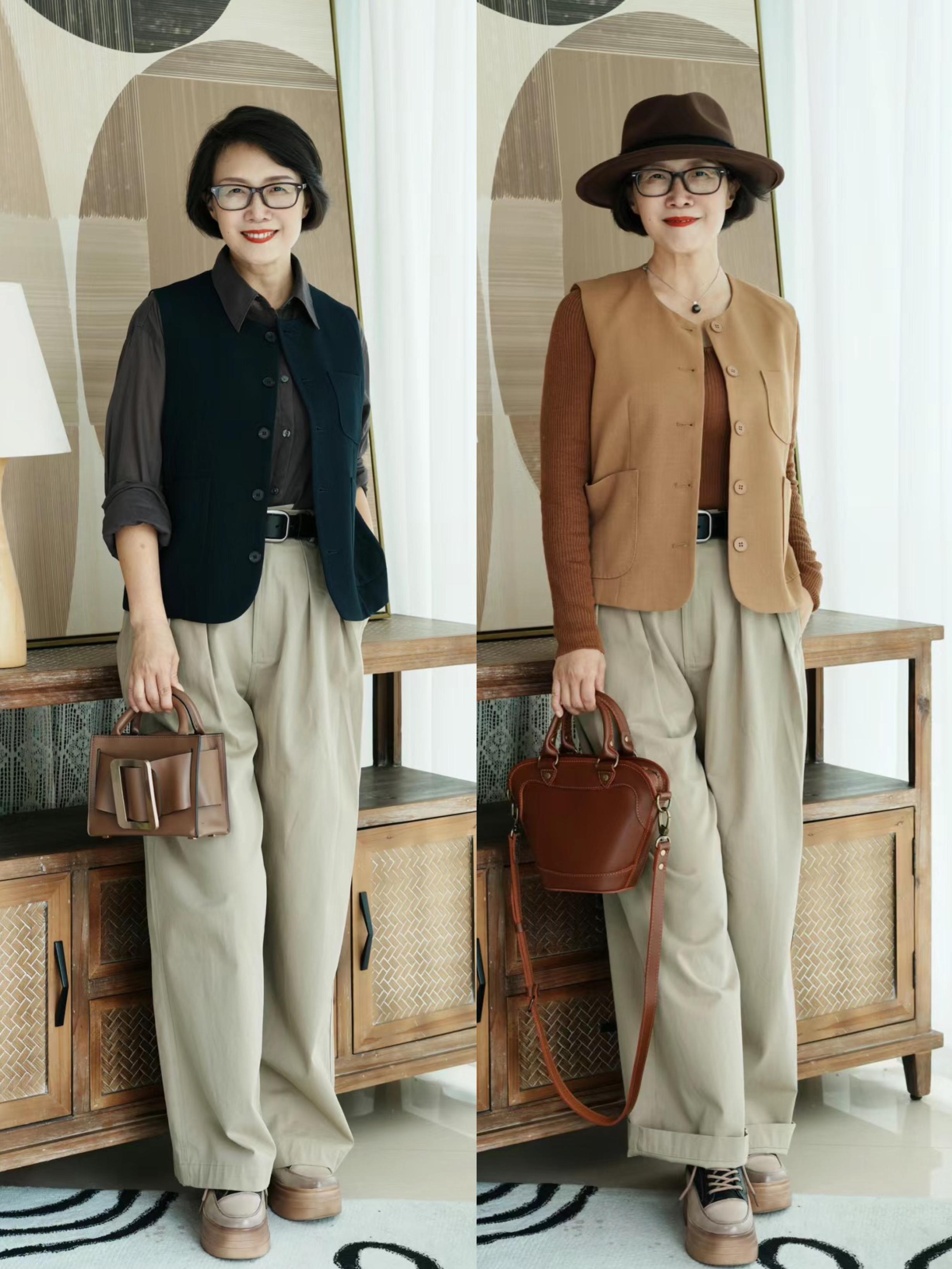 選擇馬甲的時候,儘量搭配比較挺闊的面料,合身但貼身的款式,讓馬甲具備了更強的包容性。像這種短款馬甲,配高腰的闊腿褲也很大氣。