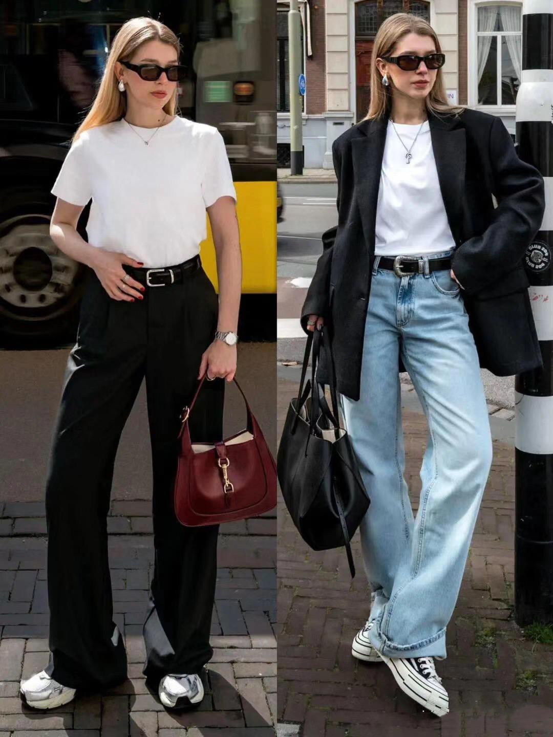 白T恤和直筒高腰褲,本就是可塑性很強的單品,配厚底鞋、黑色皮帶/腰帶,廓形西服外套,整體風格帥氣拉風,就真的很颯。皮帶/腰帶的搭配,也是點睛之筆。
