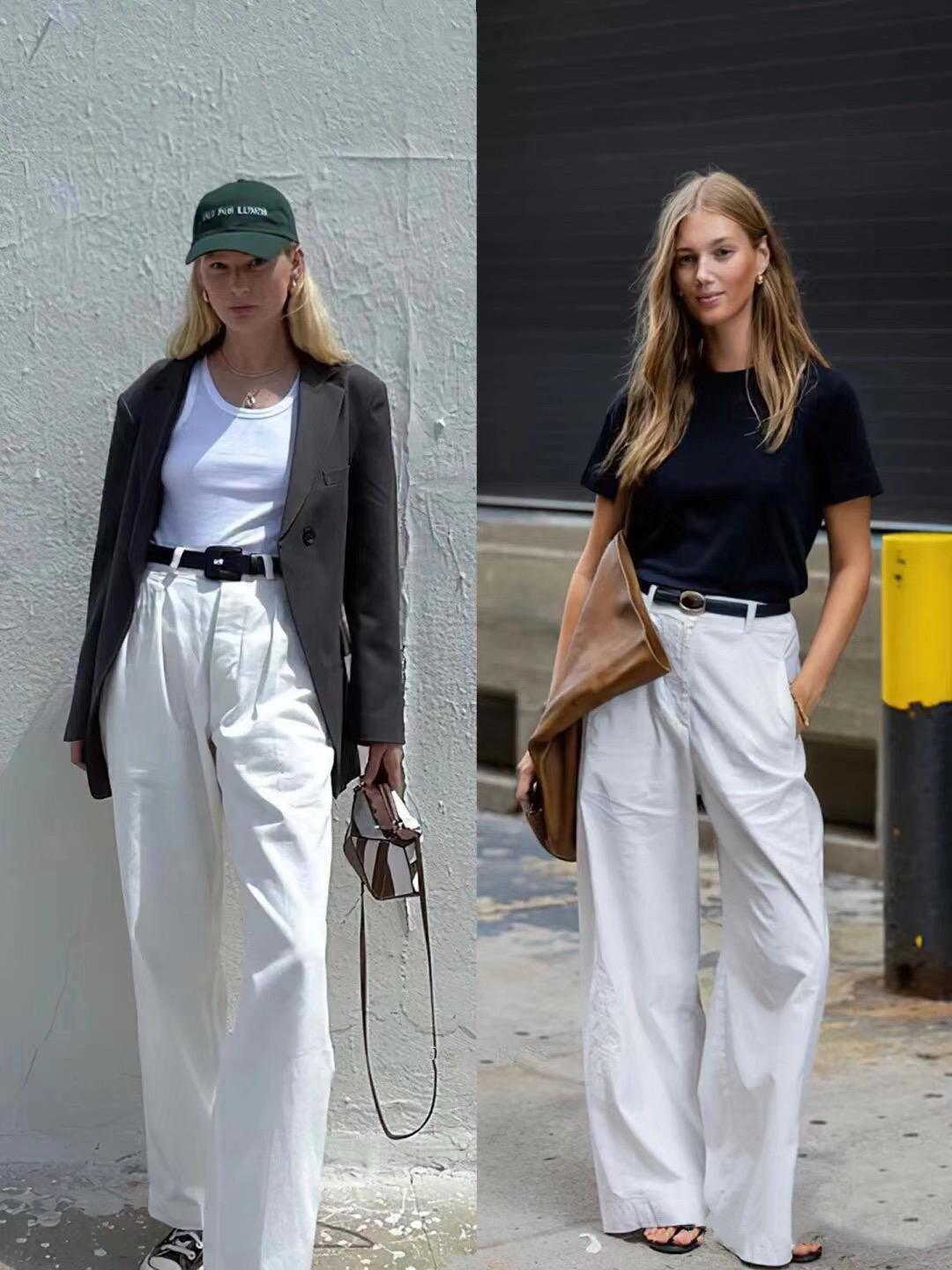中性風的配色,能讓我們的穿搭更加矚目,也更有力量感。修身T恤+白色闊腿褲,是隨性又休閒的美,很颯、很高級,配厚底拖鞋也比較自在。