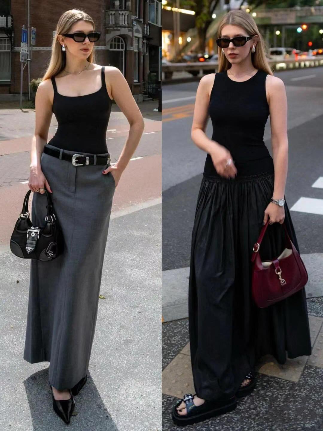這些單品的選擇,一定要注意品質的把控。凸顯颯美、帥氣的效果,一定不能太過廉價。像這種小背心,配同色系的半身裙,或者寬鬆T恤+直筒牛仔褲,都帥氣耐看。