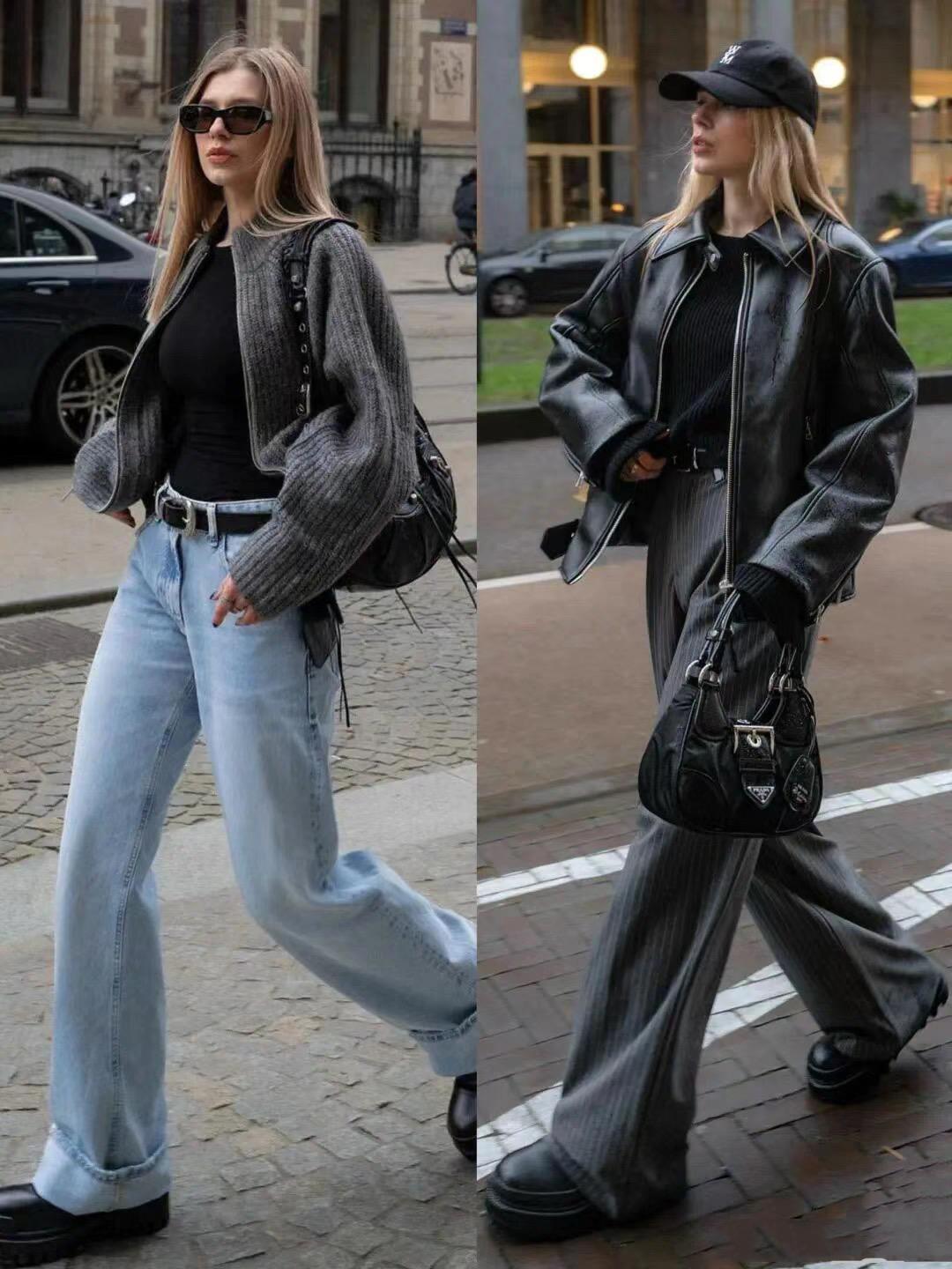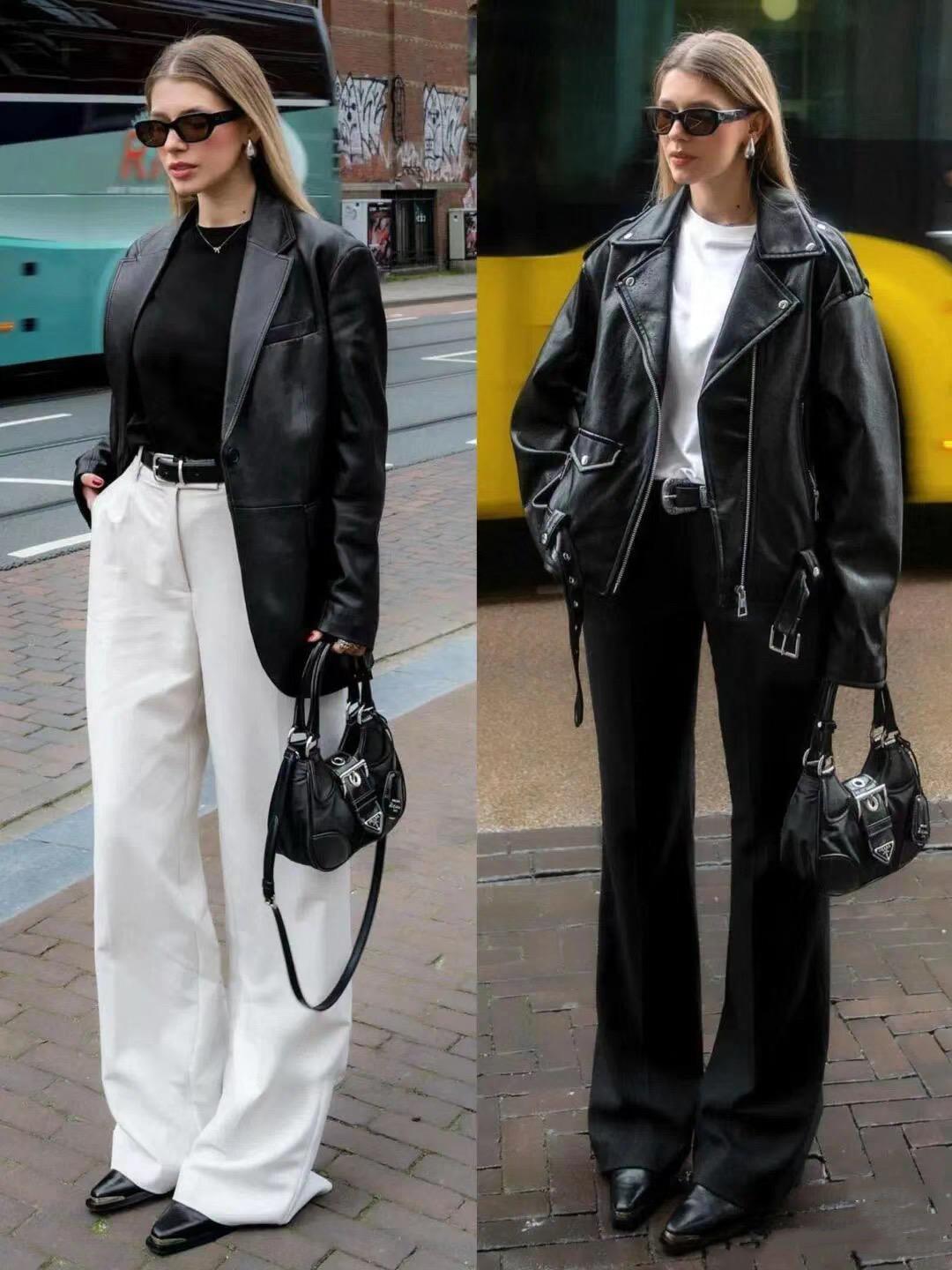 西服外套、皮衣外套,高腰的直筒褲、尖頭的厚底皮鞋,在歐美博主的穿搭下,也酷颯又時尚,讓簡單的穿搭變得更耐看。