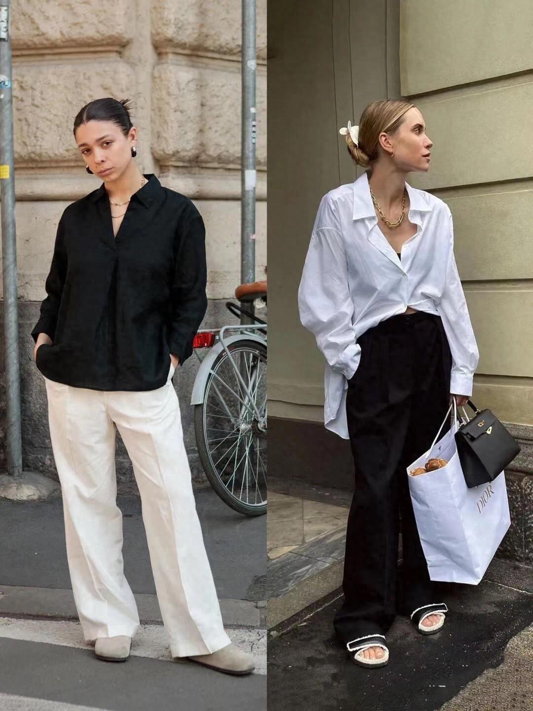 歐美風的穿搭,以酷颯帥氣爲主要特點,配色上也是以經典的中性風爲基礎。比如黑色小吊帶、或者藏藍色的T恤,都可以配高腰的白色闊腿褲。