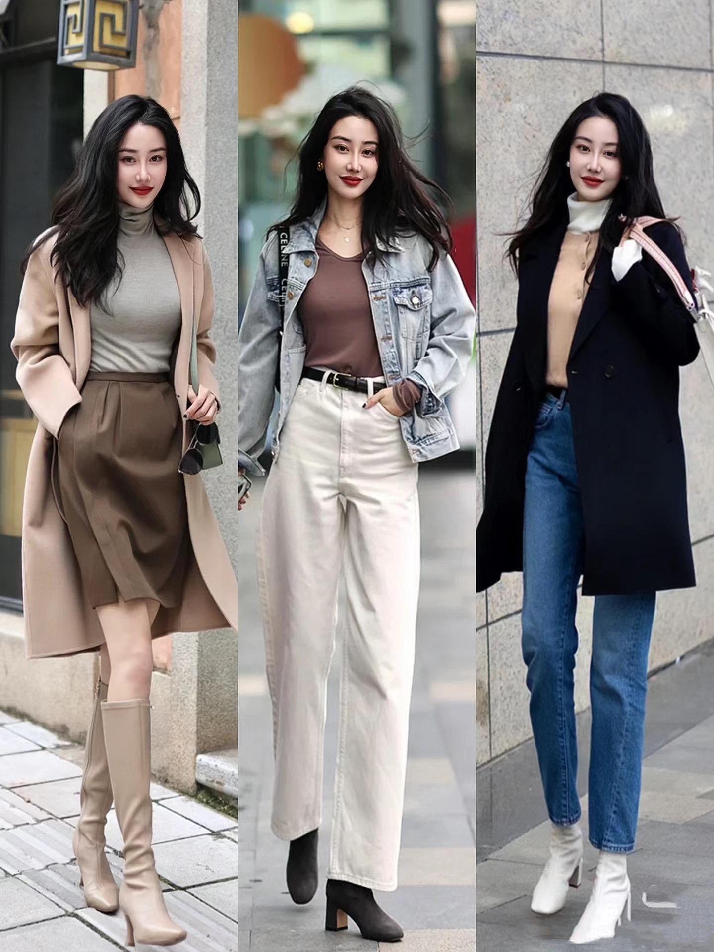 適當的高腰線、以及稍微帶跟的鞋子,會讓我們的穿搭變得更時髦精緻。修身打底衫、高腰的直筒褲、及踝的短靴、或者裸色長靴,都很提氣質。