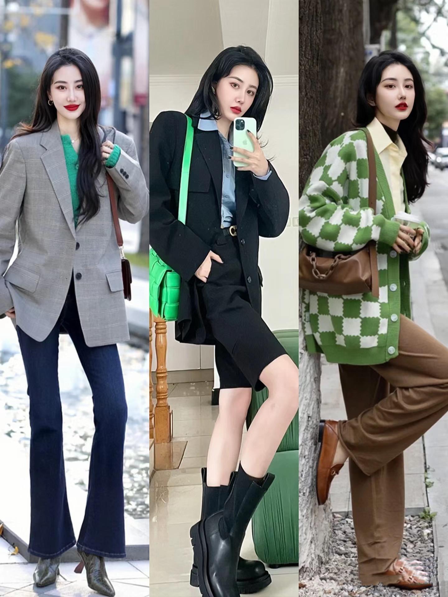 黑色的西服套裝,配上淺藍色牛仔襯衫,是帥氣又醒目的美,搭配綠色包包,明媚又溫暖。入秋後淺藍色襯衫+黑色西服套裝,也可以穿得很高級。