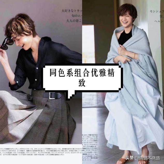 爲了更好的保持利落感,還需要我們多關注下色彩的配合問題。相對於暗色調的鞋子,淺色系的鞋子穿起來會更加淡雅一些,能夠更好的突出質感,配上稍微深一些顏色的過膝裙,上下配合增加深淺對比,瞬間穿出了層次感。比如富岡佳子的這個搭配,灰色+黑色,薄荷綠+卡其色等等,精準拿捏色彩比例,製造了身材的纖細感。
