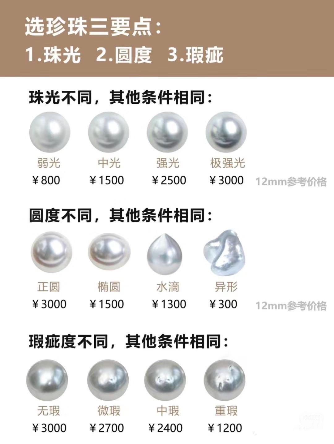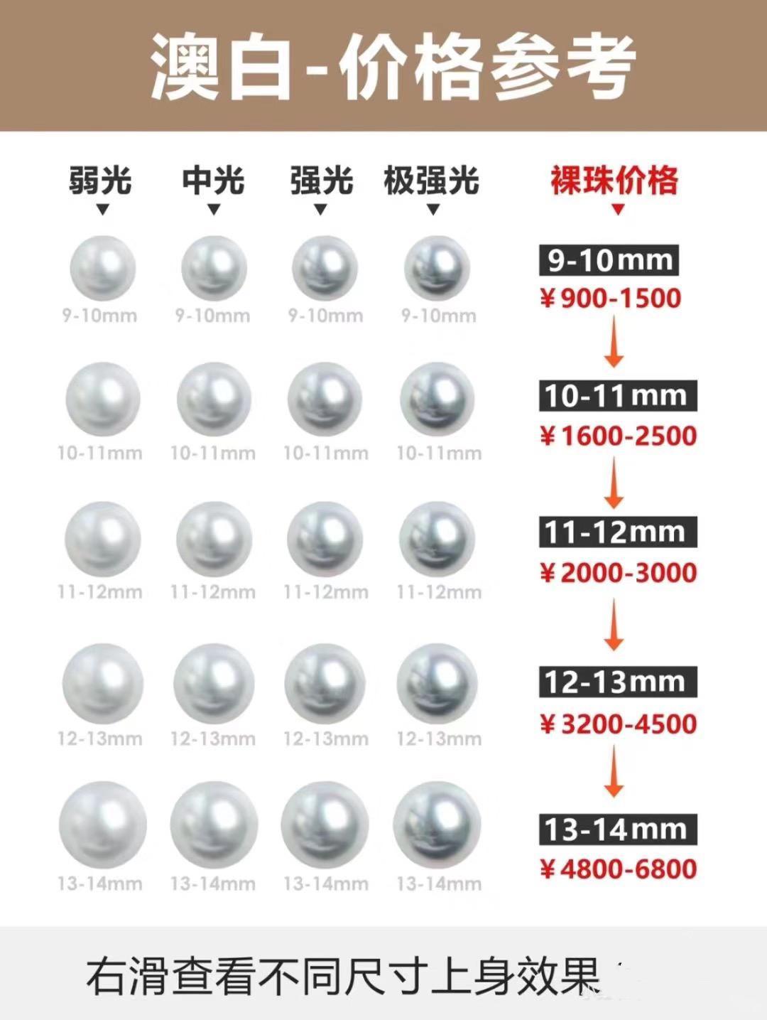 參考價格,對於澳白珍珠的真假,就能大致分辨一二。一般而言澳白珍珠的價格不會有太大的變動,如果澳白珍珠比圖示價格便宜很多,這時候就需要小心了。