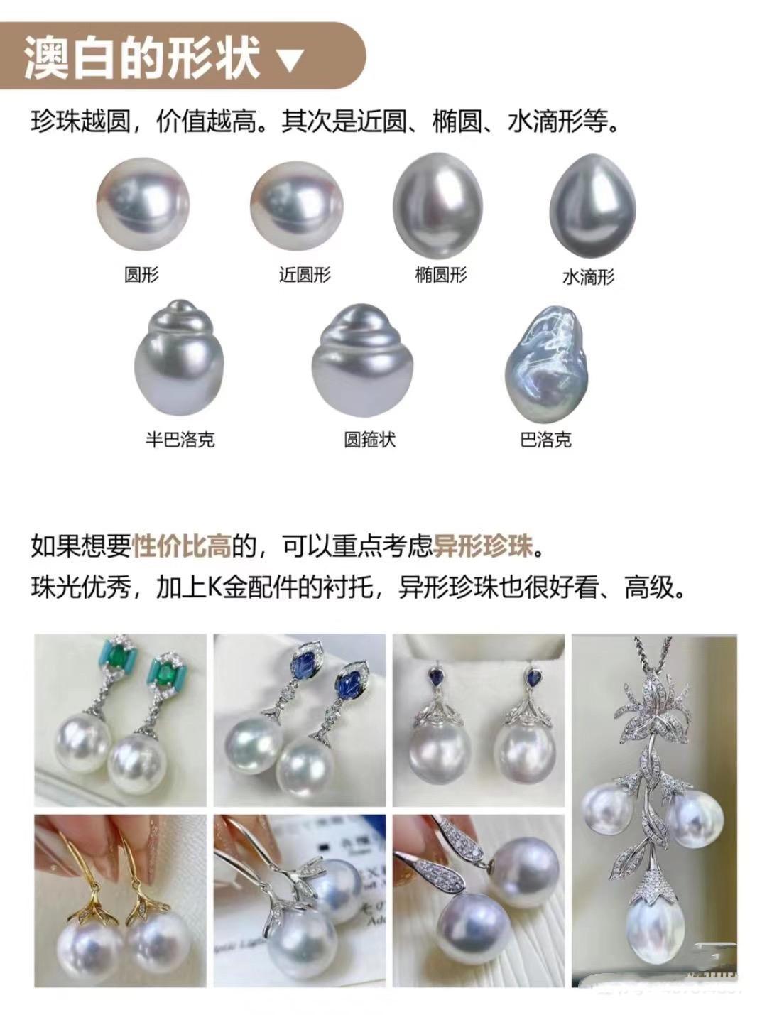 選擇珍珠,自然是以圓爲貴。澳白珍珠也不例外,珍珠越圓潤、價值就會越高。其次是近圓、橢圓、水滴形、半巴洛克、圓箍狀、巴洛克珍珠等。