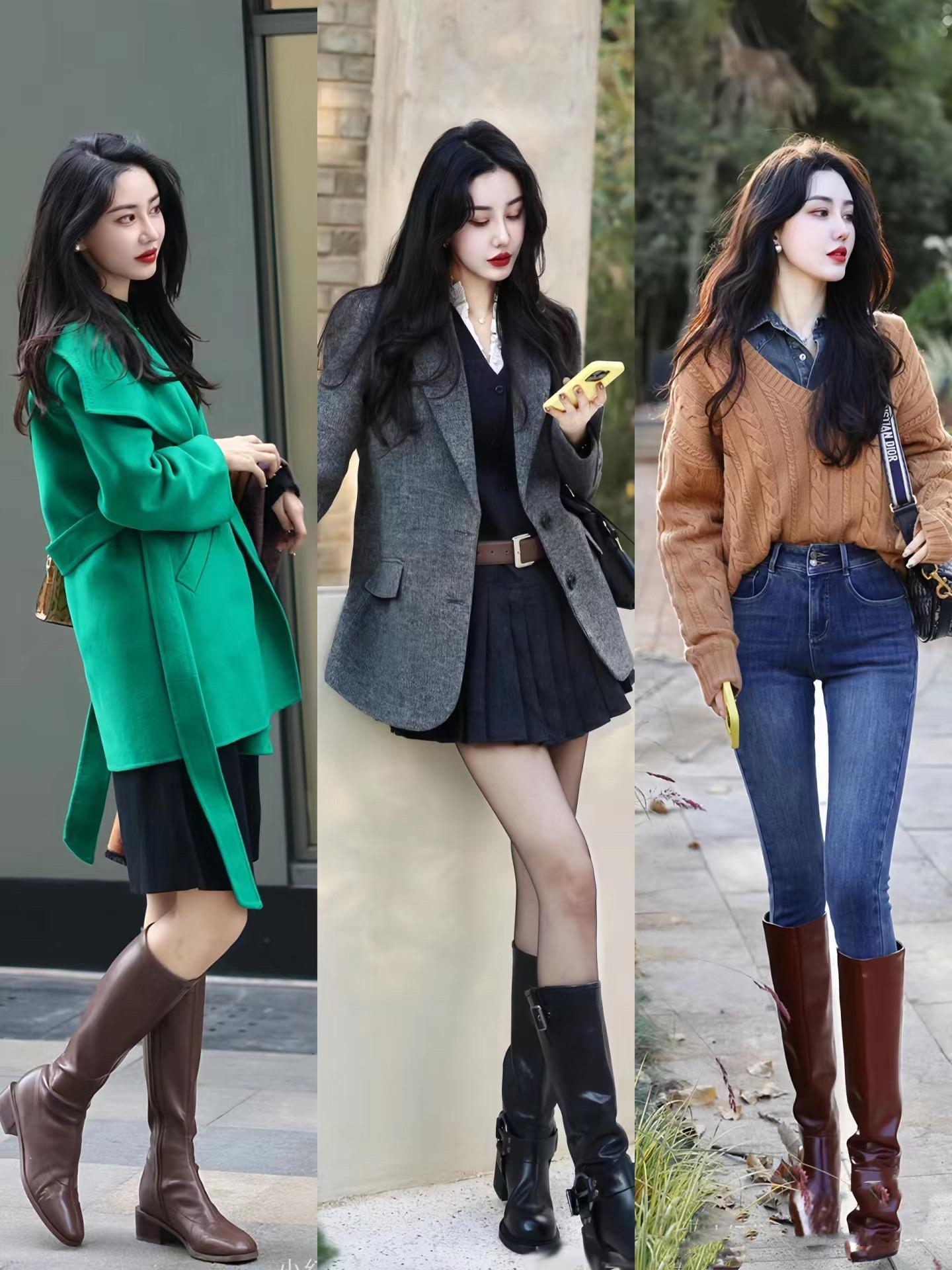 及膝的長靴,可以配超短裙、也可以配牛仔褲。及膝長靴我們可以配騎士靴,騎士靴的酷颯與超短裙的性感,完美融合,又美又拽。