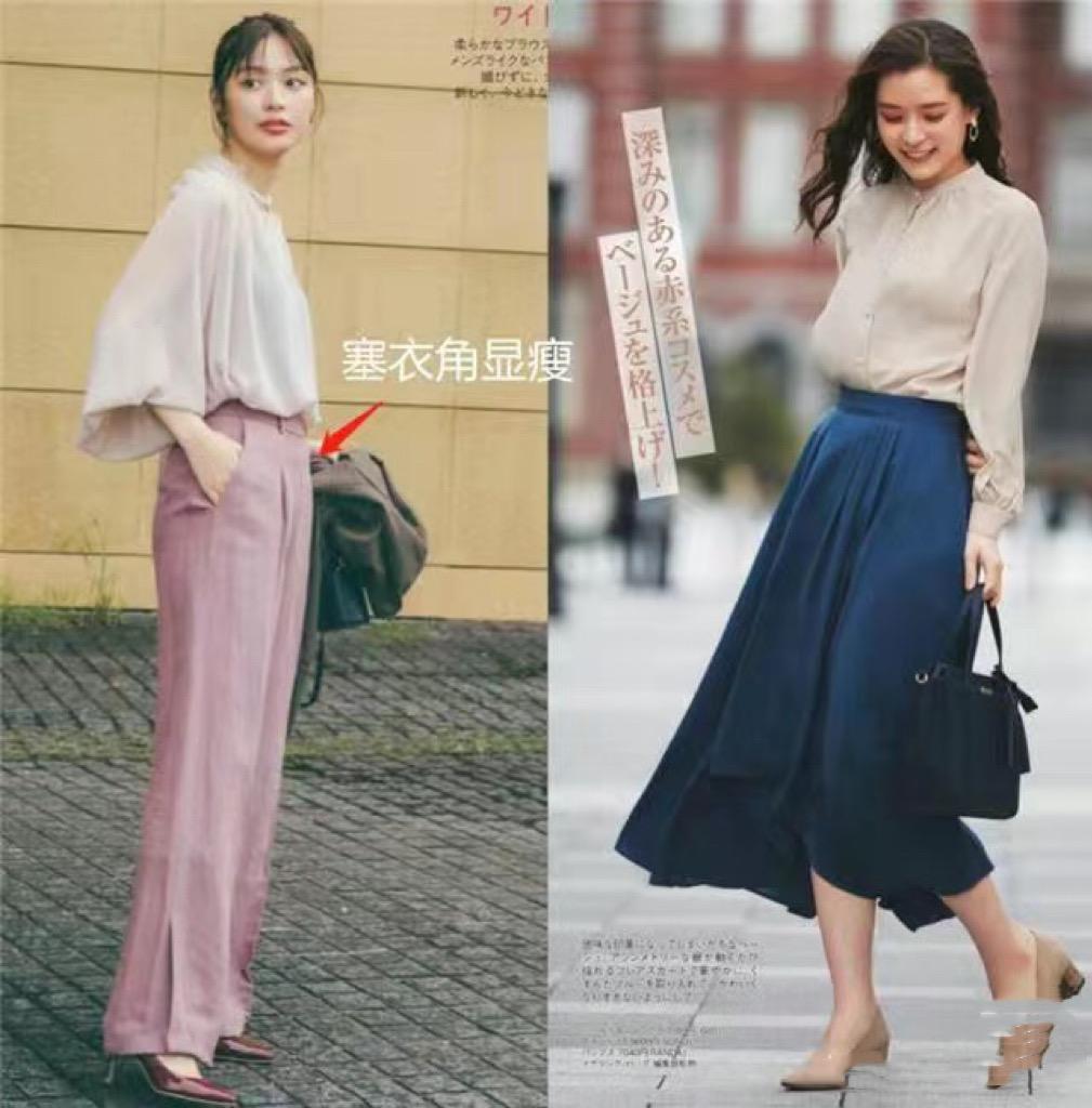 我們將衣服下襬塞進裙腰或者褲腰裏,並且自然的向上提一下上衣,營造出一種空氣感,腹部稍微有一定的餘量,就不會顯得太過緊繃。