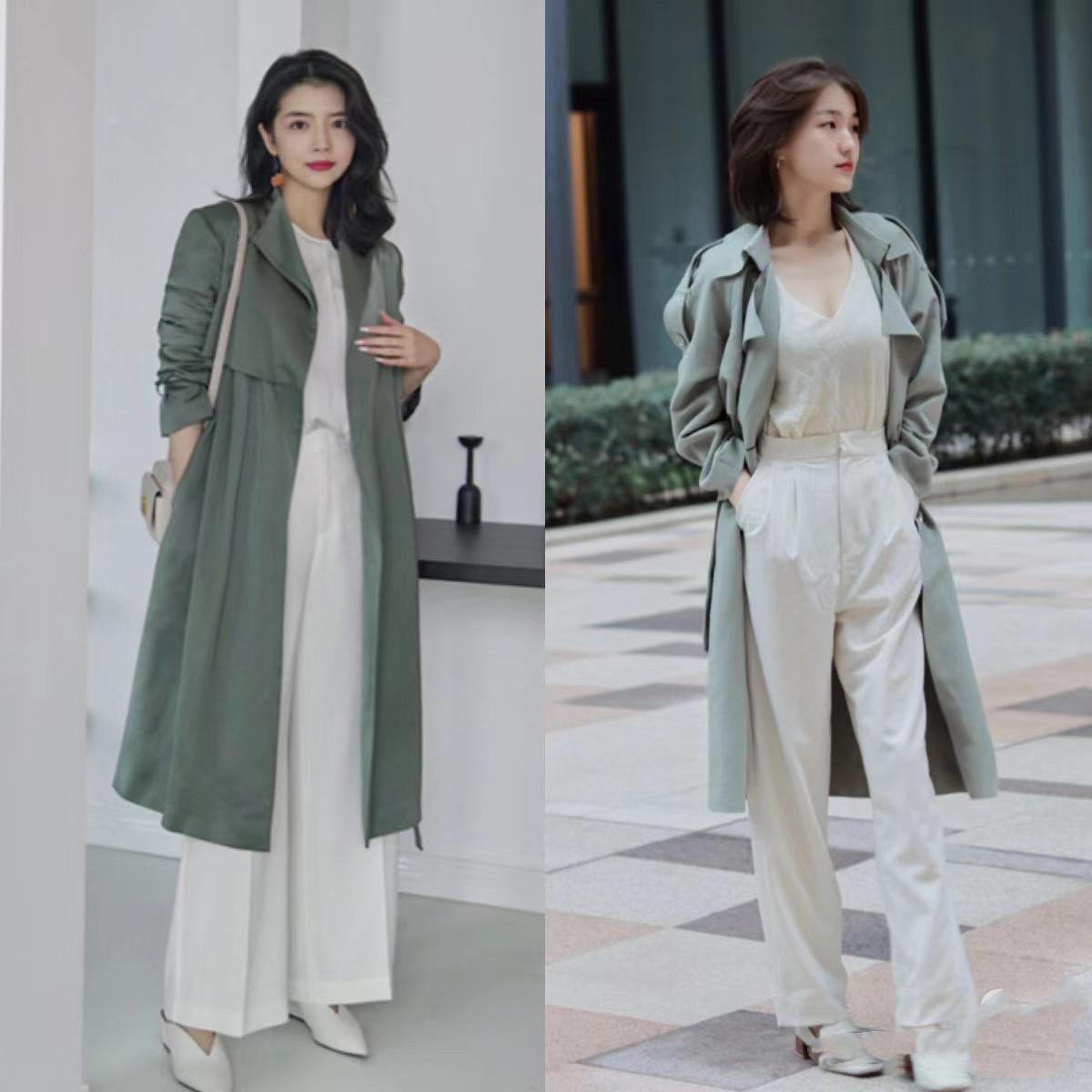 軍綠色的風衣,屬於一種自帶酷感的單品。軍綠色與白色系、也是一種很顯白又顯貴的組合。