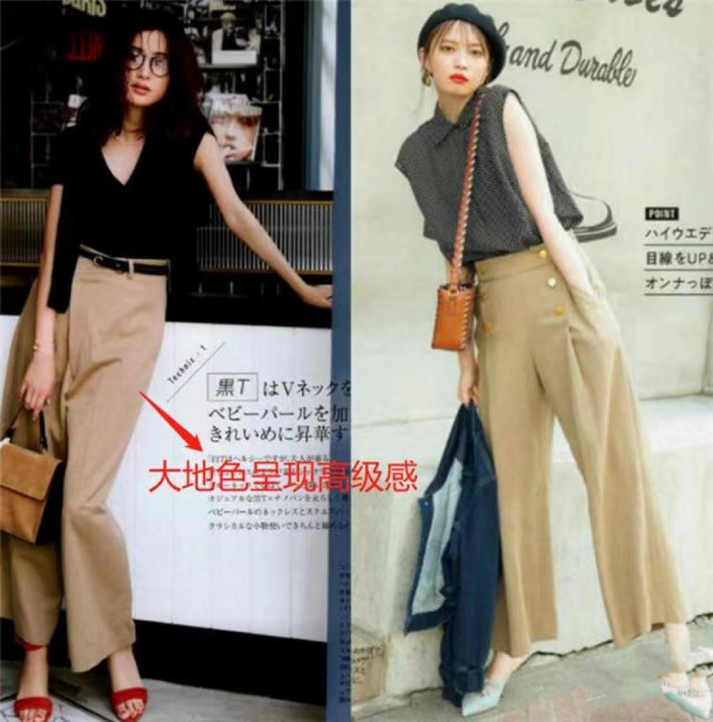 大地色的高腰褲,可以配黑色或者灰色的上衣,大面積的大地色,自帶一種高級感,用大地色配明亮一點的色系,適當的顯年輕。