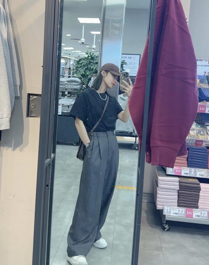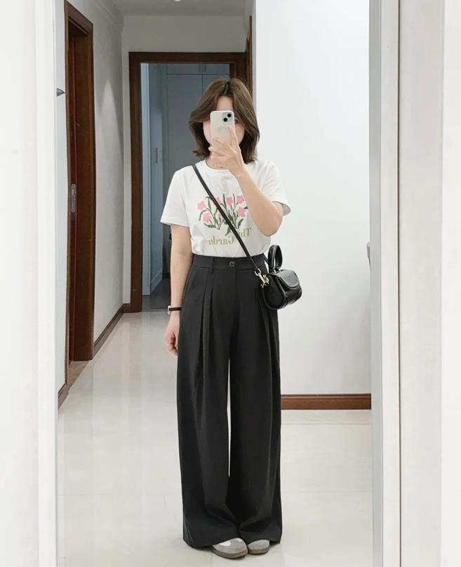 150小個子女生也適合的西裝闊腿褲,高級灰色,真的是非常百搭耐看,加上褲子的面料垂墜感極佳的,質感也很棒,穿起來不僅舒適自在,還能將雙腿比例拉得很修長。上衣配的是一件短袖t恤,記得要把上衣塞進褲子裏面,這樣才能更好顯高挑。