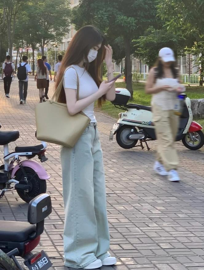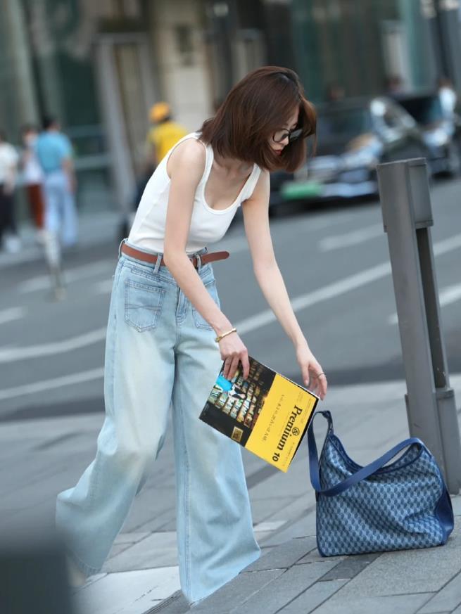 牛仔闊腿褲可是最經典百搭的款式了,基礎簡約款,最好搭配衣服了,寬鬆的褲型,感覺無論是什麼身材都能駕馭。小個子女生在穿的時候,記得要把腰線比例給拉長起來,上衣配一件白色背心,夏天這樣穿可清爽涼快了。