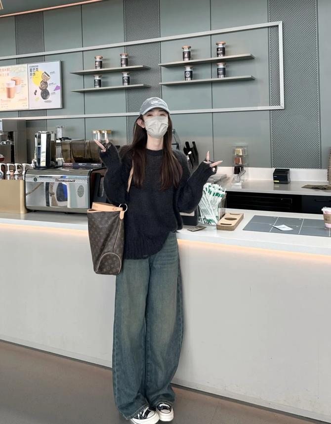 一進入秋冬季節,就是最合適穿毛衣的季節了,這一件黑色基礎款毛衣,可百搭耐看了,加上寬鬆的版型,非常藏肉顯瘦。選擇一條牛仔闊腿褲來配,褲子的垂墜感極佳,能把雙腿比例拉得很修長,配上一雙帆布鞋,可休閒舒適了。