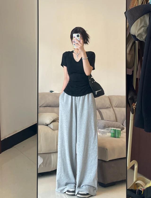 黑灰的配色真的是永不過時呢,上短下長的搭配,最適合小個子女生們了,下身胖的梨形身材們,也要試試這樣穿,這種褲子版型可太藏肉顯瘦了,黑色修身短袖t恤+灰色運動闊腿褲,這種褲型不挑身材,穿起來能很好拉長整個身材比例。