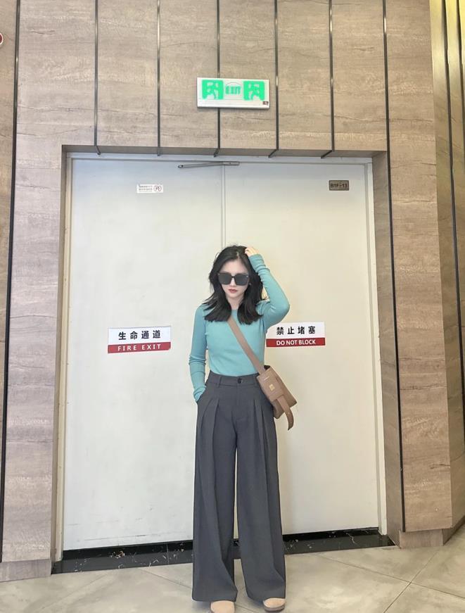 一緊一鬆的組合,那可真的是太修飾身材了,特別是上身瘦,下身胖的姐妹,就可以這麼穿,低飽和度亮色的打底衫+灰色西裝闊腿褲,鬆弛感十足的一套裝扮,顯瘦的同時又很藏肉,褲子的垂墜感極佳的,能把腿部線條給拉長。