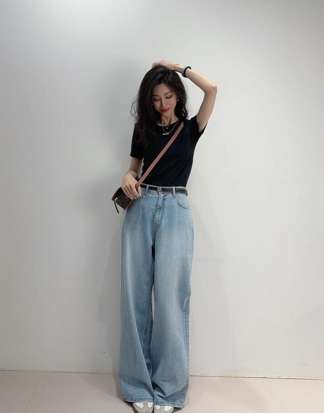 黑色短袖t恤+牛仔闊腿褲,像這樣的搭配可真的是太日常休閒了,喜歡這種版型寬鬆的褲子,穿起來可太藏肉顯瘦了。腳下踩着一雙運動鞋,穿着舒適自在又休閒,小個子女生可以在腰間增加一根腰帶點綴,可以起到很好的修飾作用,顯瘦效果極佳的。