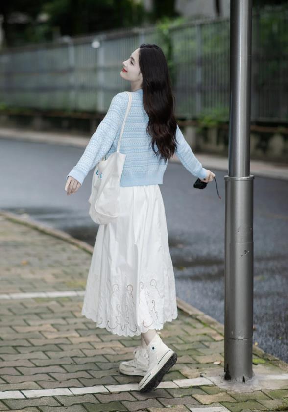 超級清新又好看的一套慵懶感穿搭,喜歡的姐妹們就學起來吧,藍色短款針織+白色半身長裙,真的太喜歡這種少女範十足的搭配了,白色帆布鞋與裙子顏色一致,增加和諧度的同時,又能讓整個穿搭看起來更和諧。