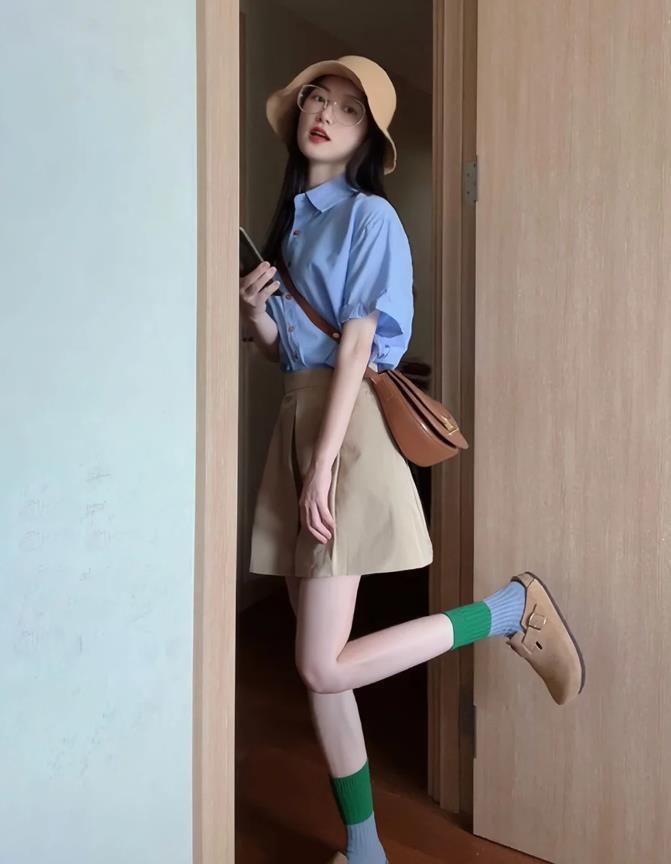卡其色也是很適合秋天的色調,不僅顯氣質還非常溫柔,這一條咖色半身短裙,小個子女生一定要試試看,只要提高腰線比例,就能很好拉長整個身材線條,搭配起一件藍色短袖襯衫,清爽又好看,夏天這麼穿正好。