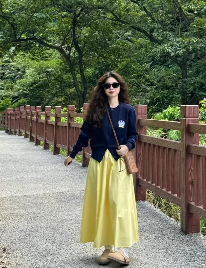 適合小個子女生的一套穿搭,藏藍色針織開衫+奶黃色半身長裙,入秋後若要穿裙子,真的建議選擇這種長款裙子,一來是可以遮擋住身上的缺點,而是自帶優雅氣質。鞋子配的是一雙勃肯鞋,穿着舒適自在又好看。