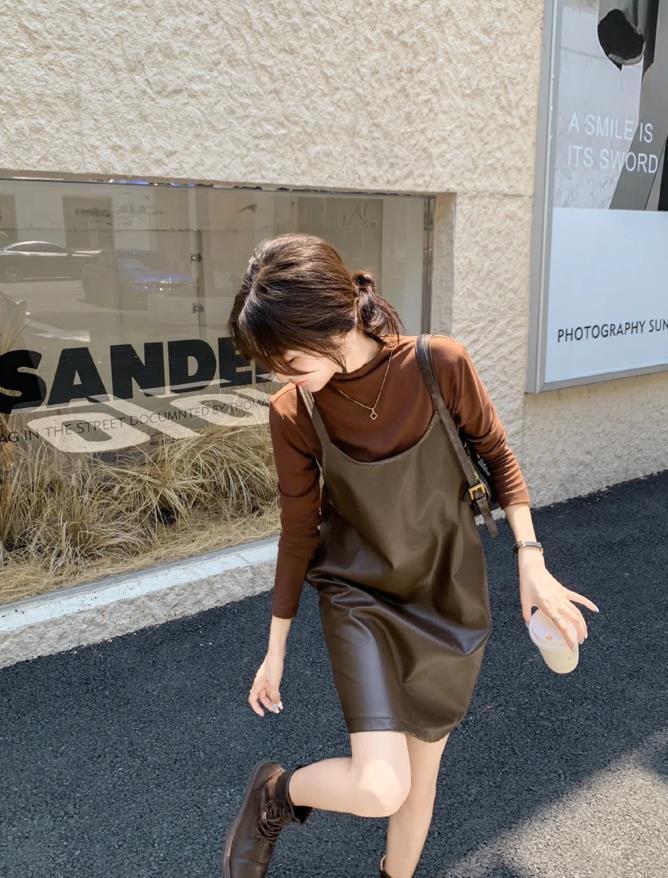 進入秋天后,美拉德風又流行起來了,這一條咖色的揹帶裙,皮質的材質,質感看着就非常不錯,直筒的裙身,可太藏肉顯瘦了。上衣配一件棕色打底衫,初秋這樣穿,真的太好看了,這麼一身看起來氣質感十足。