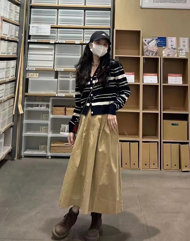 米白色針織衫,柔軟舒適又百搭,深v領的設計,很好拉長脖子線條,能在視覺上打造出高挑感,也修飾了肩寬的缺點,很顯瘦。選擇一條卡其色的半身長裙來配,這種傘字形狀的裙子可太瘦身了,溫柔氣質又好看。