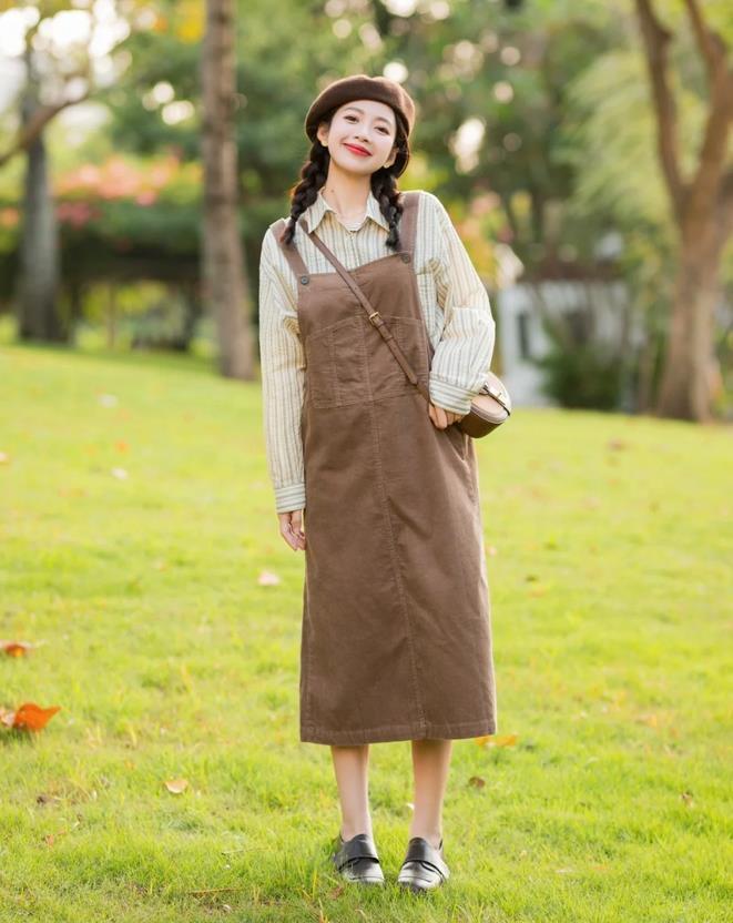 秋天被棕咖色吸引住了,這一條棕咖色揹帶裙,版型是直筒的,穿起來可太藏肉顯瘦了,內搭一件條紋襯衫,簡繁的組合,輕鬆打造出層次感。減齡又復古的一套,喜歡的姐妹們學起來就對了。