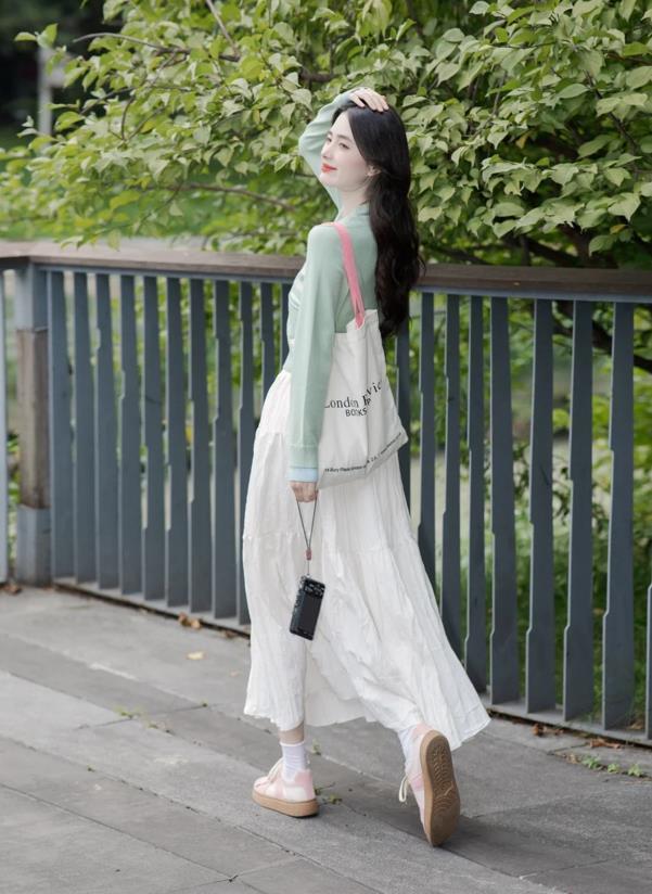 簡簡單單的就很好看,很適合早秋的溫柔打扮,小個子女生也可以借鑑起來,淺綠色針織衫,面料很柔軟舒適,貼身穿也沒有任何問題,搭配起一條白色半身長裙,裙子的垂墜感極佳的,可以把整個身材比例拉得很修長。