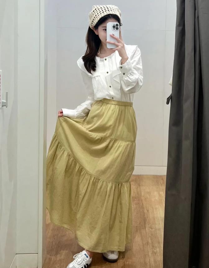 日系清冷感的一套,看起來也太不錯了吧,在秋天真的非常喜歡卡其色裙子,半身長款裙子,太藏肉顯瘦了,也能自帶優雅氣質感,選擇與綠色襯衫相配,一簡一繁的組合,可太時髦了,有種很鬆弛隨性的範。