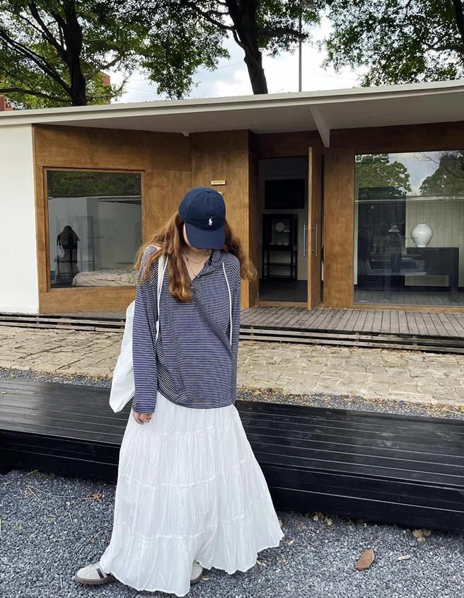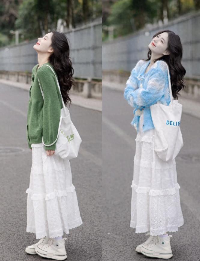 你可以永遠相信白色裙子,a字版型的半身長裙,最藏肉顯瘦了,這個裙身梨形身材的女生們大膽穿起來就對了。仙氣感十足的款式,與藍色毛衣相配,藍白相配也太清爽乾淨了吧,很襯膚色和顯白。