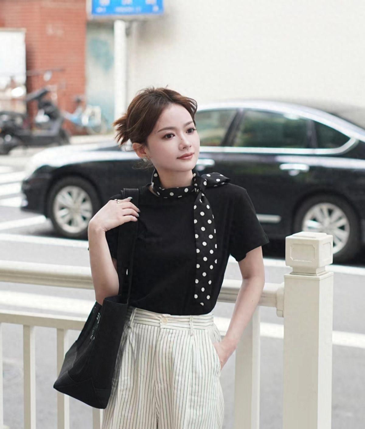 如同這身“藍色半領短袖+黑色闊腿褲+黑色涼鞋+黑色單肩包”,包包顏色與衣服顏色相呼應,既能打造簡約氣質感,又促進整體造型風格協調統一。