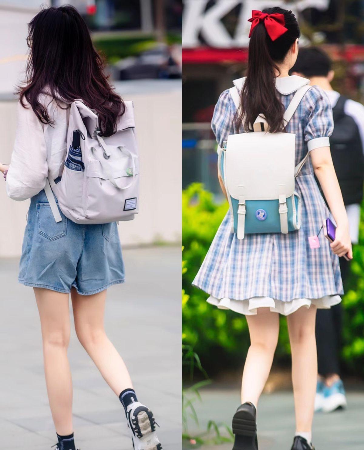 左圖搭配的帆布包,充滿青春活力氣息,一看,就是屬於年輕姑娘的菜;右圖中搭配的手提包,簡約大氣,更能凸顯出中年女人特有的知性美。