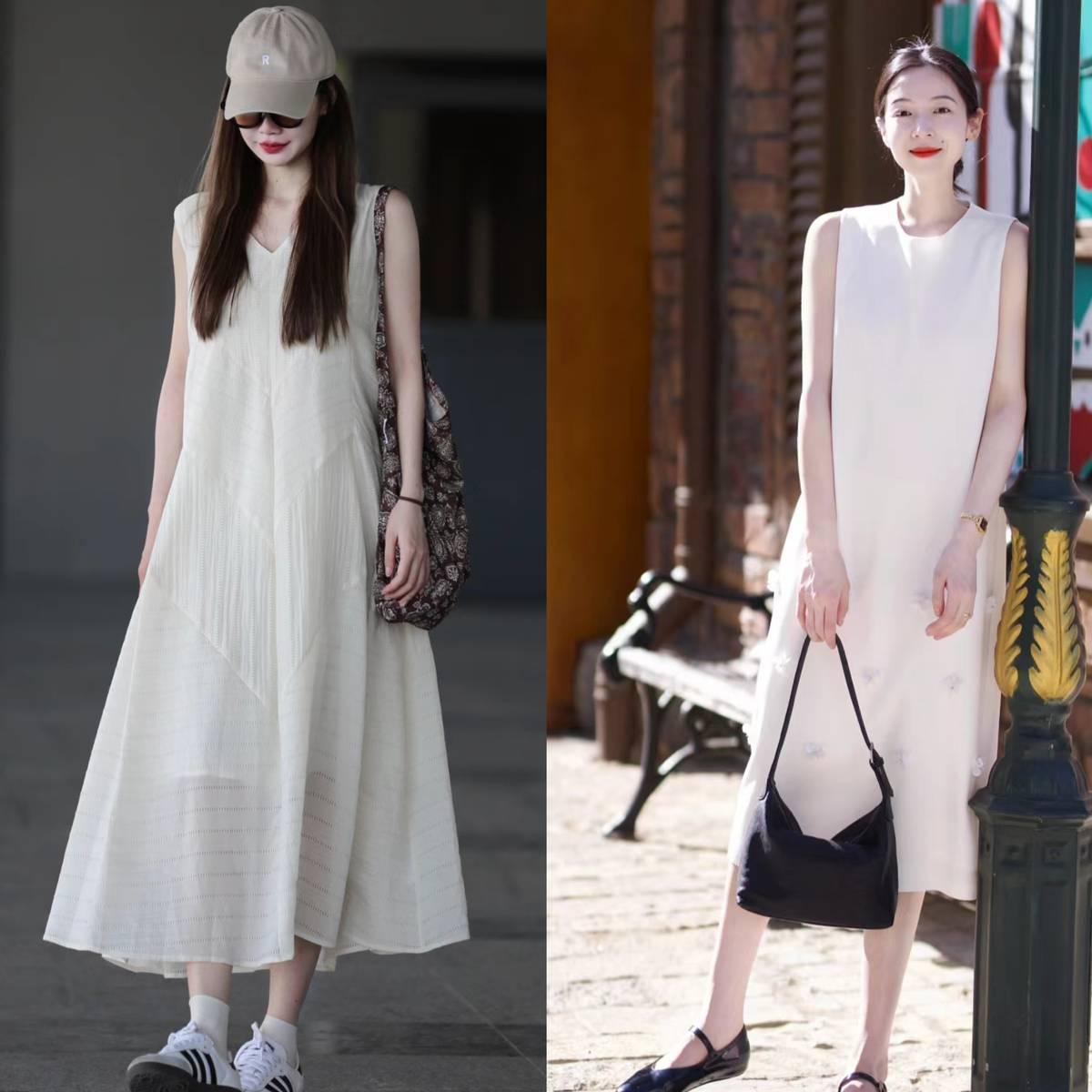 譬如下面這組穿搭對比圖。同樣是白色連衣裙,同樣是無袖款式,卻因爲搭配的包包不同,演繹出不一樣的魅力。