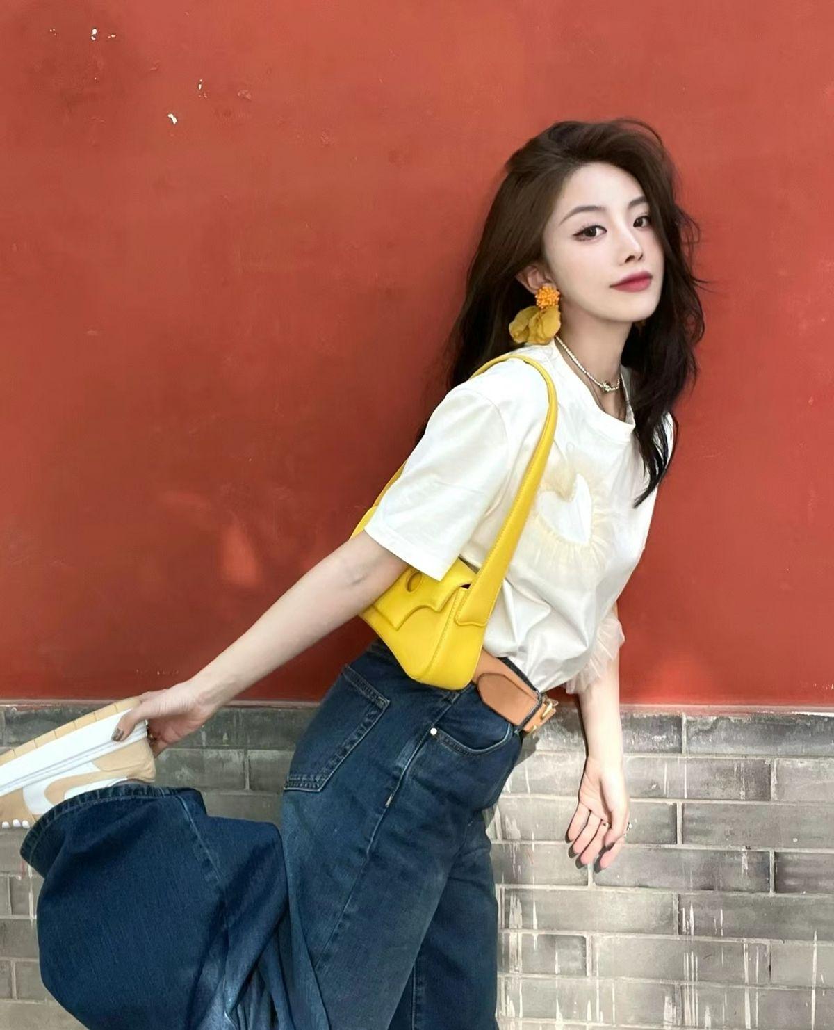 當然,你也可以採取異色系配色,譬如這身“白色T恤+藍色牛仔褲+黃色單肩包”造型,不僅吸睛亮眼,還充滿個性 ,更讓人眼前一亮。只是,這種配色方案考驗穿着者的搭配功底,一般人駕馭不了。