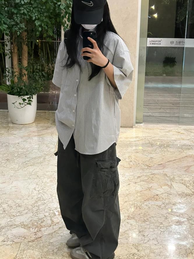 夏天這麼穿實在是太帥了,頗顯中性風的打扮,喜歡的姐妹們就可以借鑑起來,條紋寬鬆襯衫+工裝褲,鬆弛感十足,還不失隨性。腳下踩着一雙運動鞋,那真的是太舒適自在了。