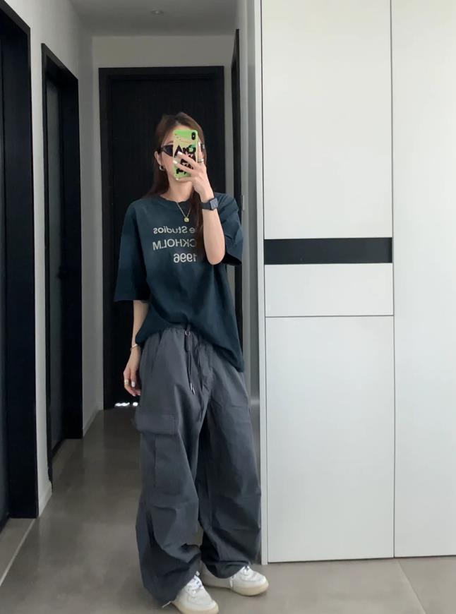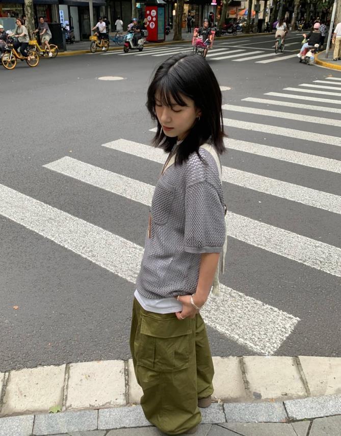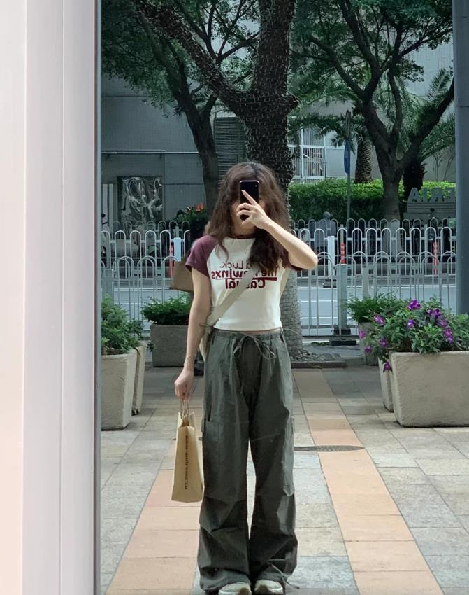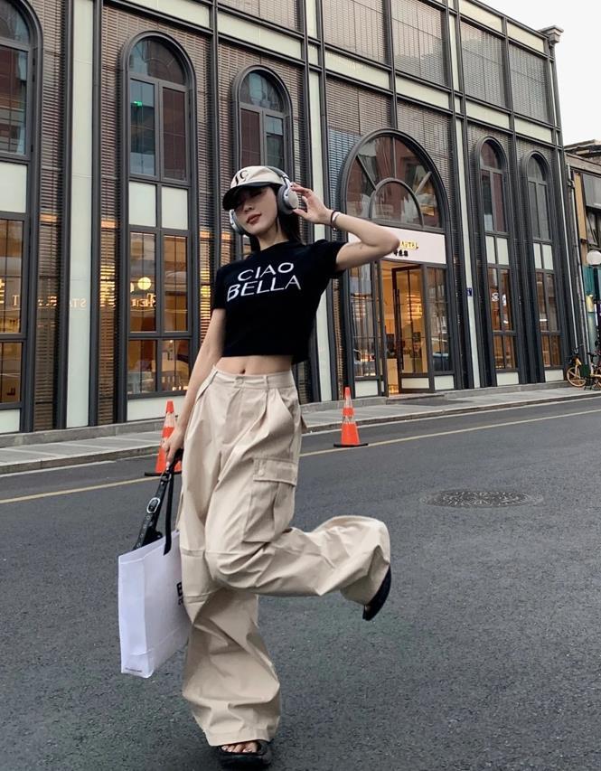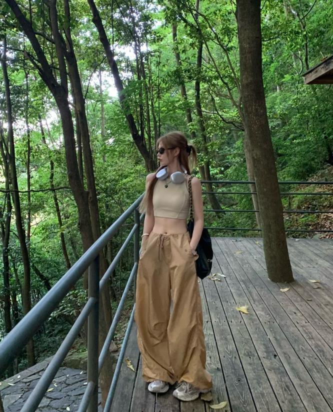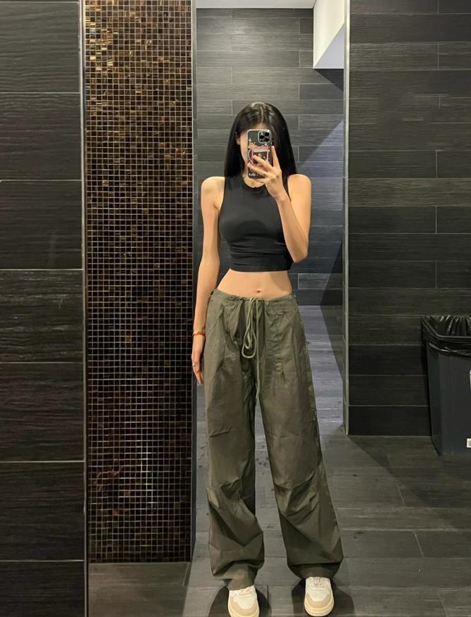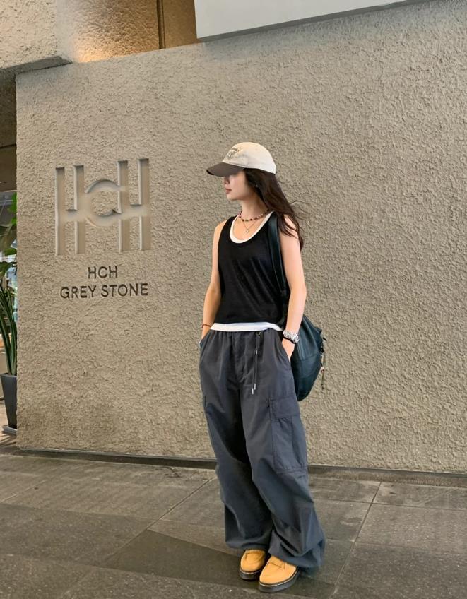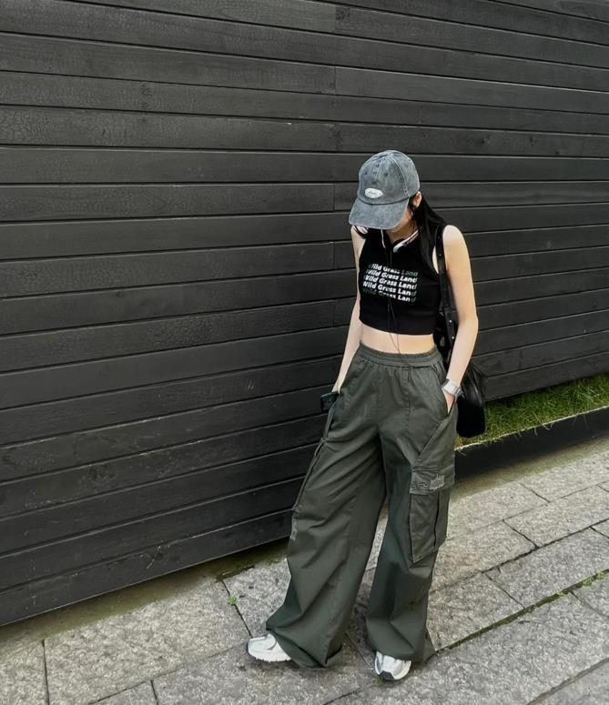 誰不愛這一套啊,鬆弛感真的是直接封神了,小短款背心+工裝褲,就一個字,絕!鬆弛感十足的褲子,對於身材一點約束感都沒有,上緊下松的搭配,不僅顯腰身,還能塑造出大長腿,選擇一雙運動鞋來配,輕鬆自在又好看。